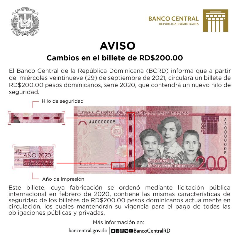 SANTO DOMINGO.- El Banco Central de la República Dominicana (BCRD) informa que, a partir del miércoles 29 de septiembre de 2021, circulará un billete de RD$200.00 pesos dominicanos, serie 2020, que contendrá un nuevo hilo de seguridad.