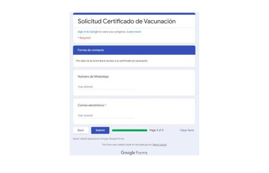 Paso 5: Debes completar las formas de contacto y vías por las cuales estarás recibiendo tu certificado digital. Puede ser un número de WhatsApp y/o un correo electrónico. Este último es de carácter obligatorio.