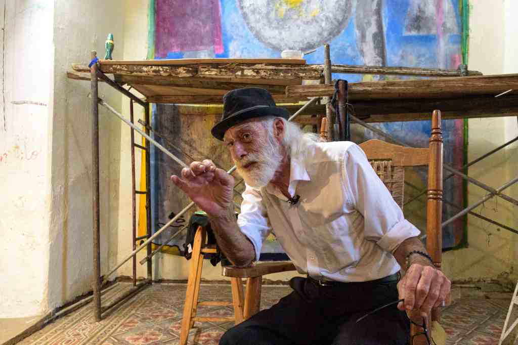 La expresión “Por amor al arte” le queda perfecta a Menicucci porque la pasión puede más. Cuando los reporteros de Diario Libre llegaron a su residencia de artistas ubicada en la calle Las Mercedes, de la Ciudad Colonial, él estaba descansando las piernas (en una tiene una pequeña prótesis) para volver a “encaramarse” en los andamios y seguir pintando la pieza que será expuesta de 11 pies de altura.