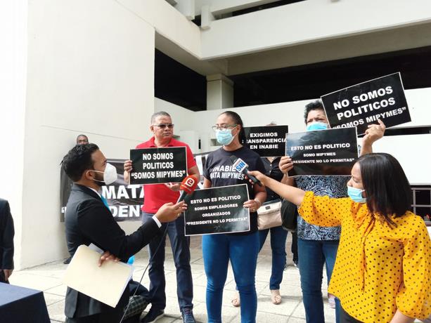 Bajo la consigna «Presidente, no lo permitas» y con pancartas en mano, los dueños de microempresas expresaron su inconformidad con la manera en la que se ha manejado el proceso investigativo que emprendió la DGCP contra la referida dependencia del Ministerio de Educación (Minerd).