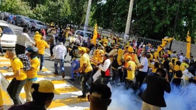 SANTO DOMINGO.-Al diputado Pedro Botello, a su esposa y demás protestantes que reclaman el 30 por ciento de la AFP le fue impedido la entrada al Congreso Nacional, lanzándole bomba lacrimógena.