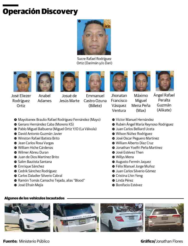 Pero eso no es todo. La organización es muy peligrosa y con un gran poder económico, establece el Ministerio Público. Supuestamente llegaron a mover más de US$250 millones en sus múltiples modalidades delictivas, y trataron de darle apariencia de licitud mediante la adquisición de lujosos bienes y creación de entramados de empresas fachadas, dedicadas al lavado de activos.