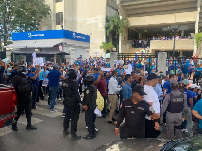 En el momento en que cientos de educadores se concentraron frente al edificio de oficinas públicas presidente Antonio Guzmán Fernández agentes policiales intentaron impedir las protestas.