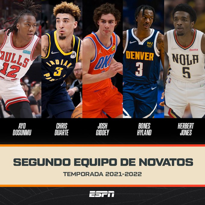 El novato dominicano de los Indiana Pacers Chris Duarte, considerado entre los mejores novatos en los primeros meses de la temporada, acumuló 52 votos para el segundo equipo All-Rookie que lo conforman Herbert Jones de New Orleans Pelicans, Josh Giddey del Oklahoma City Thunder, Bones Hyland de los Denver Nuggets y Ayo Dosunmu de Chicago Bulls.
