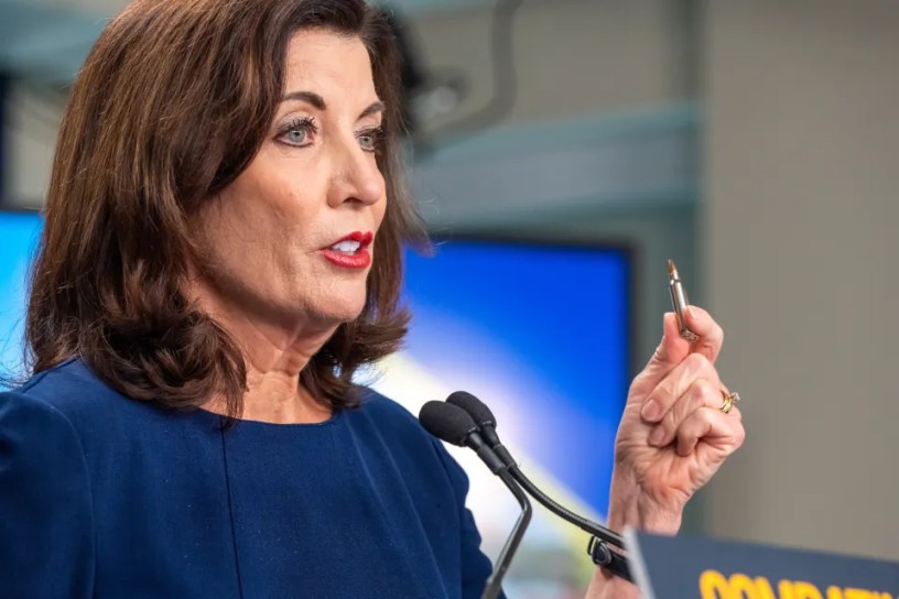 Sosteniendo varias balas en sus manos, Hochul explicó que aún existen vacíos legales que dificulta el accionar de los uniformados, y por eso pide revisar y ampliar la definición de arma de fuego.
