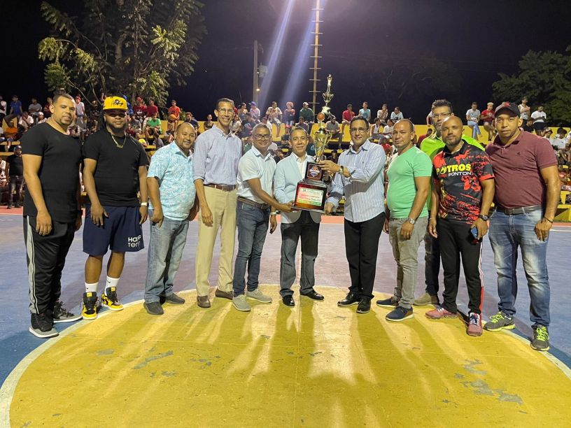 El Lic. Henry Santos Lora, presidente de Coopopular junto al vicepresidente,Ing.Germán Taveras, entre otros colaboradores de la entidad cooperativa, hicieron el saque de honor en el segundo partido de la serie final,Elvis Rodríguez presidente del comité organizador recibió la copa en opción al evento.
