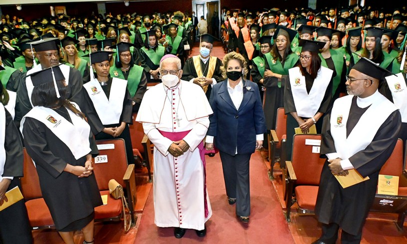 Monseñor Ramón Benito Ángeles, obispo auxiliar de la Arquidiócesis de Santo Domingo y rector de la UCSD, en el discurso central felicitó a la primera promoción en la Licenciatura en Negocios Internacionales, graduándose cinco jóvenes todos con honores entre “Summa cum laude”, “Magna cum laude”.