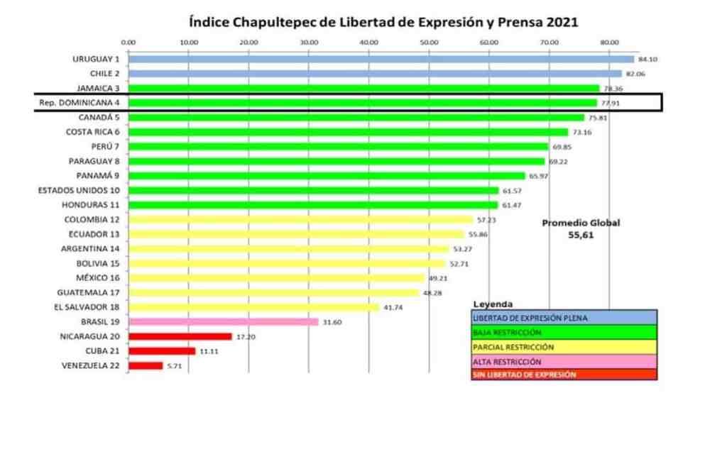 La Sociedad Interamericana de Prensa (SIP) presentó este martes el Índice de Chapultepec de Libertad de Expresión y de Prensa, que muestra cómo la República Dominicana pasó, en el período 2020-2021, al lugar número cuatro de las naciones en las que se percibe una baja restricción de la libertad de expresión, contrario a la medición realizada para 2019-2020, cuando le fue otorgado el lugar 14.