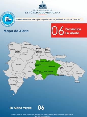 Las provincias en alerta verde son, Santo Domingo, Monte Plata, San Cristóbal, Peravia, Monseñor Nouel y Sánchez Ramírez.