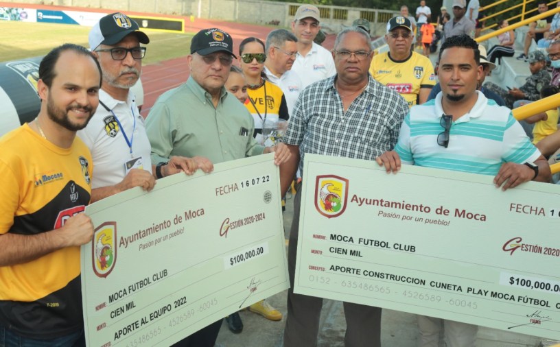 El alcalde de Moca Guarocuya Cabral, en compañía del regidor Guillermo Ferreira y presidente del Concejo Municipal, los servidores municipales Froilán Mercedes y César Pérez, entregan a José Bautista presidente de Moca FC, dos cheques de cien mil pesos, por un total consolidado de doscientos mil pesos como aporte al fortalecimiento institucional con el club mocano.