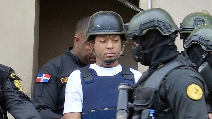 “Rochy RD” fue trasladado al tribunal bajo estrictas medidas de seguridad, con chaleco antibalas y casco protector.