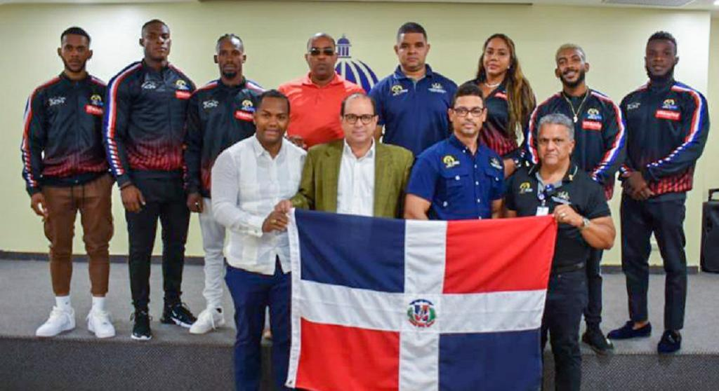 DISTRITO NACIONAL, República Dominicana (05-08-2022).- El viceministro administrativo del Ministerio de Deportes, Franklin de la Mota, entregó la bandera del país, a la delegación dominicana que participará, este fin de semana, en la VI Copa Tatons´2022 de fisiculturismo y fitness, que con 7 tarjetas IFBB élite pro en juego, se realizará en Caracas, Venezuela.