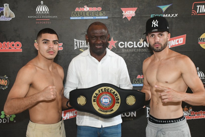 Isidro Mieses (centro), alcalde de Sabana Grande de Boyá, sostiene el título latino la AMB que se disputarán este viernes Rafael Hernández, de Venezuela y José Aguirre, de Puerto Rico.