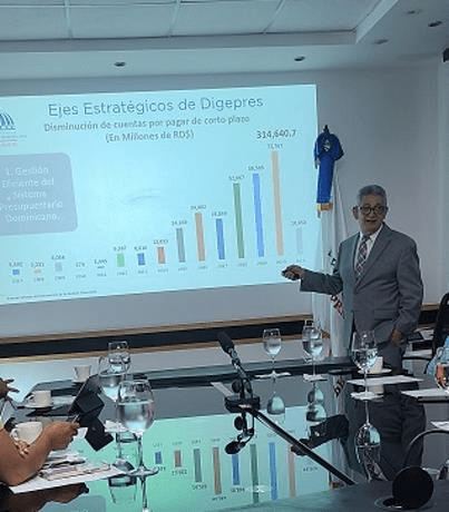 Rijo Presbot habló hoy en un encuentro con periodistas en la Digepres, donde explicó la 2Gestión presupuestaria del Gobierno en tiempos de crisis”.