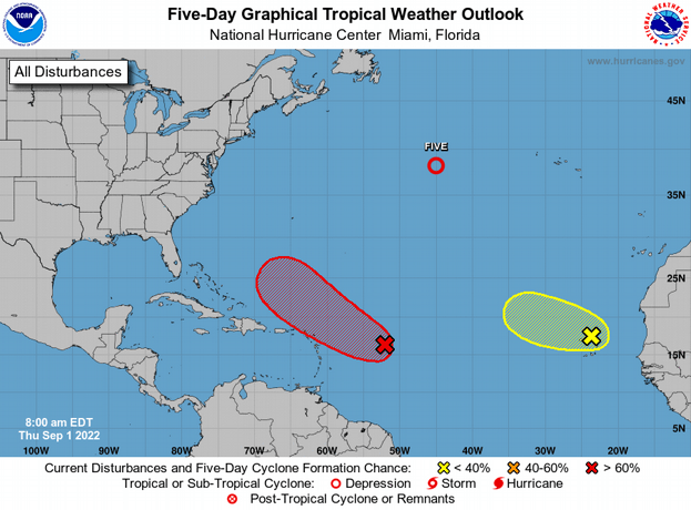 El Centro Nacional de Huracanes informó que se formó, en el Atlántico, la depresión tropical número cinco de esta temporada ciclónica 2022.