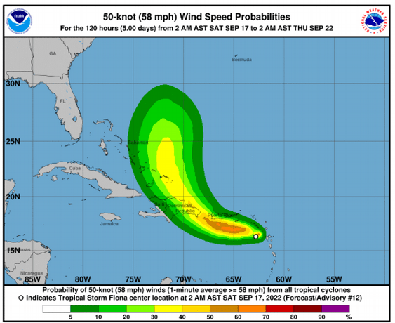 Se espera que el centro de Fiona se mueva cerca o justo al sur de las Islas Vírgenes y Puerto Rico desde hoy hasta el domingo, y se acerque a la costa sur u este de República Dominicana el domingo por la noche y el lunes.