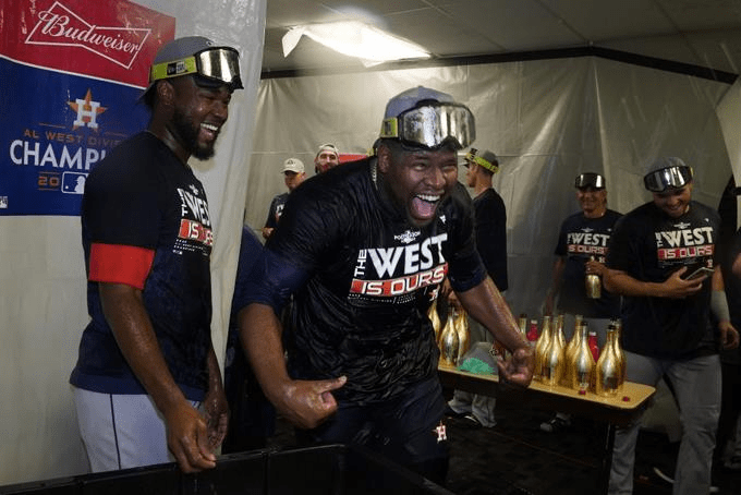 Varios jugadores de los Astros festejan la conquista de un nuevo cetro divisional en el Oeste.