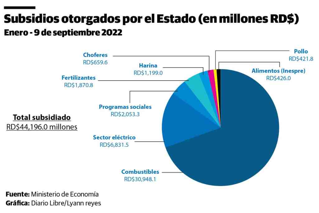 En el Informe de Situación Macróeconómica hasta agosto de este 2022, el Ministerio de Economía indica también que, después de los combustibles, en magnitud de subsidios siguen el sector eléctrico y los programas sociales, con 6,831.5 millones de pesos (15.4 %) y 2,053.3 millones de pesos (4.6 %), respectivamente, entre enero y el 9 de septiembre de 2022.