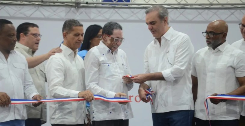 El presidente Luis Abinader corta la cinta y le hace entrega a Leonidas Batista, presidente del club Rafael Leonidas Solando. Desde la izquierda, Ramón Antonio Valdez, Comisionado Nacional de Boxeo, Eduardo Sanz Lovatón, Kennedy Vargas y Ángel de la Cruz, durante la inauguración. Por: Jorge Gonzalez
