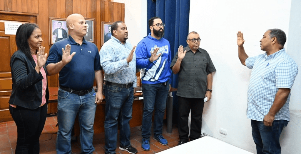 Aurelio Henríquez, presidente del Colegio Dominicano de Periodistas (CDP), proclama a los integrantes de la plancha Leo López que ganó en las elecciones de la ACDSD y que encabezó Américo Celado, a la derecha de Henríquez, seguido de Víctor Isaac Calvo, Neftalí Ruiz, Odalis Sánchez y Ursula Espinal.