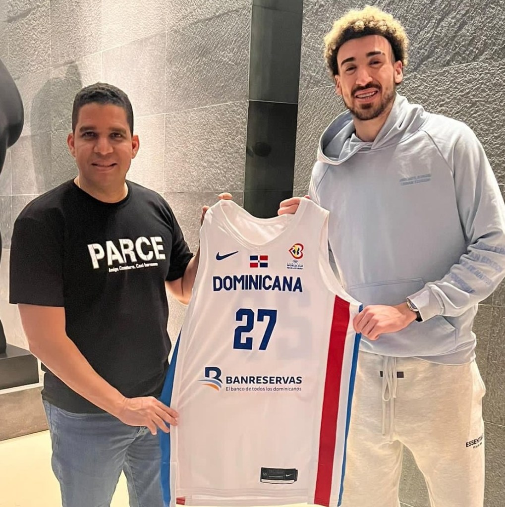 Rafael Uribe, presidente de Fedombal, y el jugador dominicano de la NBA, Chris Duarte.