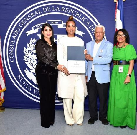 Tras culminar su ponencia la especialista fue sorprendida con un reconocimiento otorgado por el consulado dominicano, el cual recibió de manos del vicecónsul Román Jáquez y la directora del departamento Comunitario, Ramona Almonte.