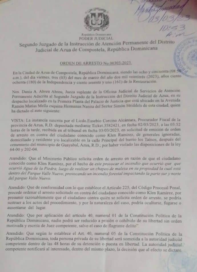 Esto lo confirma una orden de arresto No. 00303-2023 del Segundo Juzgado de la Instrucción de Atención Permanente del Distrito Judicial de Azua, del pasado 3 de marzo, donde se acusa al ciudadano Klenny Esther Ramírez Familia de provocar un incendio en Agua de la Piedra.