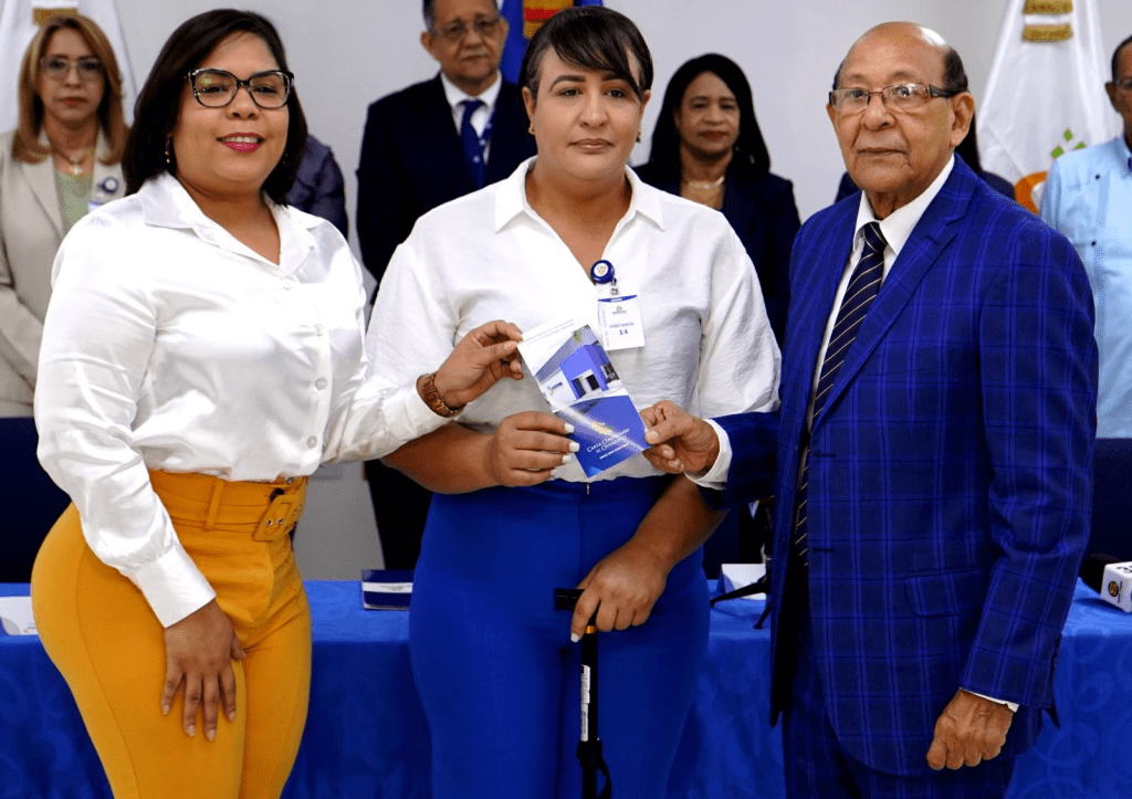 Pie de foto: De izquierda a derecha: la viceministra de Servicios Públicos del MAP, licenciada Sheyla Castillo; la afiliada Cristina Matías Rosado y el director ejecutivo del IDOPPRIL, doctor Fausto López Solís.