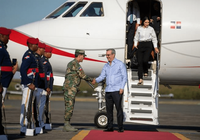 A su llegada a la terminal aérea de San Isidro, Abinader y sus acompañantes fueron recibidos por el ministro de Defensa, teniente general Carlos Luciano Díaz Morfa; el comandante del Primer Regimiento Dominicano Guardia Presidencial, general de brigada Guillermo Caro Cruz y el subcomanadante de la Fuerza Aérea de República Dominicana, general de brigada paracaidista Mauricio L. Fernández García.