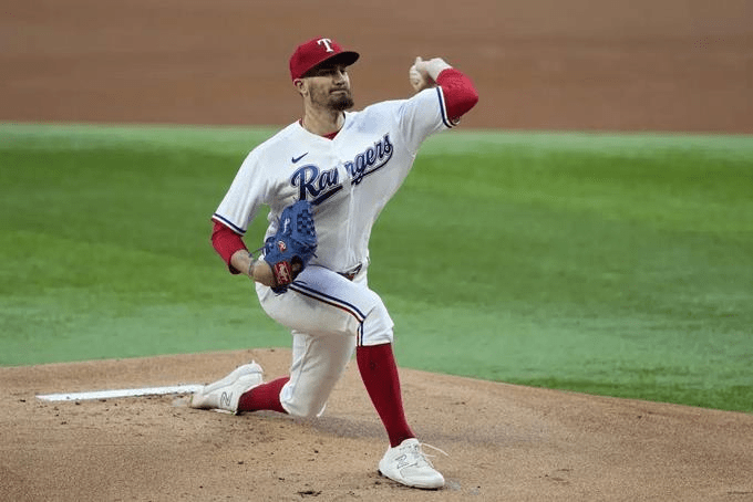 Andrew Heaney empató el récord de la Liga Americana ponchando a nueve bateadores consecutivos. Texas tuvo tres jonrones, incluyendo el grand slam en la sexta entrada del cubano Adolis García en la victoria de los Rangers por 11-2 el lunes ante los Reales de Kansas City.