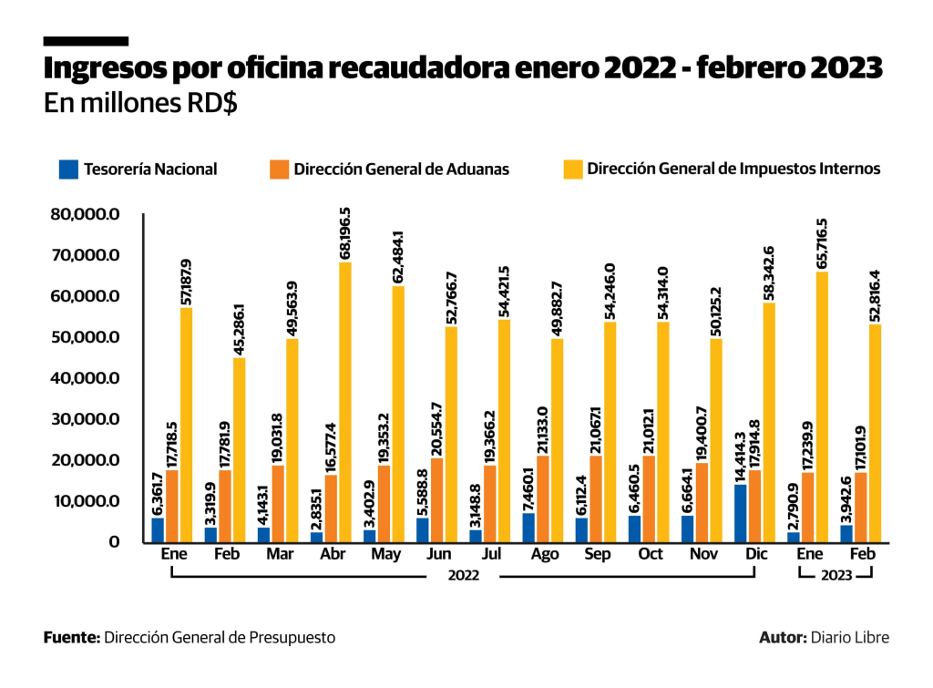 Los ingresos percibidos por la Dirección General de Impuestos Internos (DGII) representaron el 74.26 % del total recaudado entre esos meses, los que ingresaron vía Aduanas fueron el 21.51 % y por la Tesorería Nacional el 4.21 %, según cifras de la Dirección General de Presuesto.