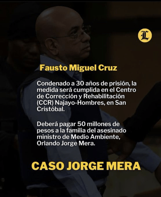 La primera dama de la República, Raquel Arbaje, reaccionó ante la condena a Miguel Cruz de la Mota “Carandai”, quien fue encontrado culpable del asesinato a tiros del ministro de Medio Ambiente. Orlando Jorge Mera.