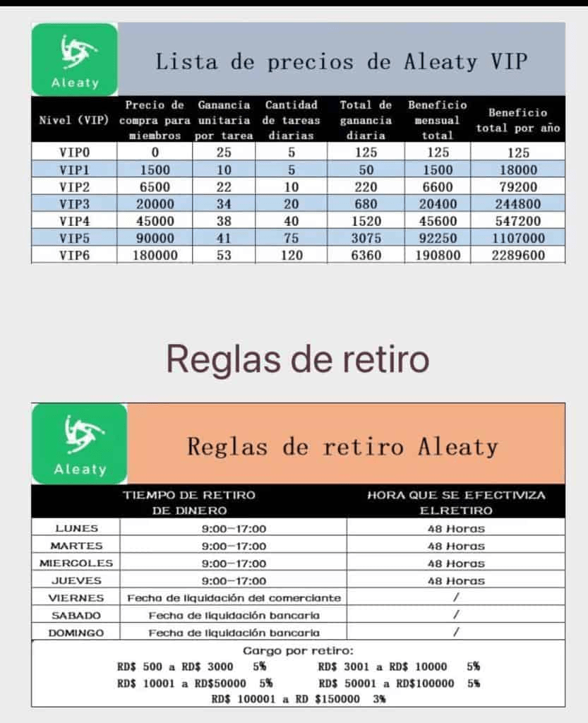 Diario Libre ingresó al portal de Aleaty y reza lo siguiente: «Estimado usuario de Aleaty: Debido a la actualización del sistema de función de tarifa de retiro, el producto debe volver a lanzarse en Googleplay, pero la aprobación llevará algún tiempo. Ahora puede completar las operaciones correspondientes a través de la aplicación de prueba interna, haga clic en el enlace para descargar…».
