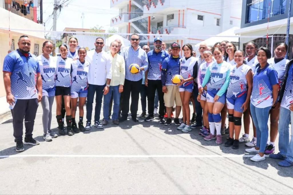 Alberto Rodríguez Mella, director ejecutivo del Instituto Nacional de Educación Física, cuando dejó iniciado el torneo de voleibol correspondiente al programa “INEFI con el Barrio” en el sector Santa Ana, en San Francisco de Macorís. Les acompañan Siquio NG de la Rosa, alcalde municipal; Franklin Romero Jr., en representación del senador; Richard Ortega, ex jugador de baloncesto; Ana Villanueva, ex atleta de karate; Armando Rendón, presidente del club Santa Ana, y Junior Matrille, coordinador de INEFI en esta ciudad.