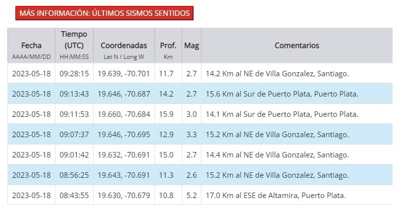 Según los datos contenidos en el portal del Centro Nacional de Sismología, las seis réplicas se registraron en menos de una hora han ocurrido en la zona de Villa González, Santiago, y Puerto Plata entre las 4:56 de la mañana y las 5:28 de la mañana.