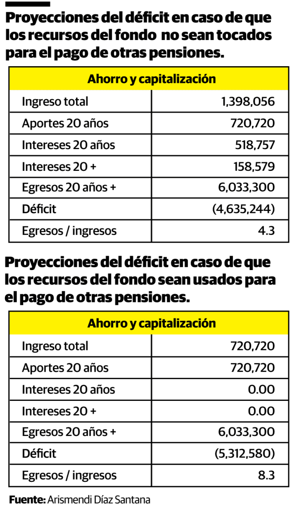 «Aportando el 10.01% mensual de su salario (que propone la comisión), al cabo de 20 años sumaría 720,720.00 pesos (30,000 salario x 10.01% de aporte x 12 meses x 20 años). En adición, obtendría unos 677,336 de intereses al 5% real anual, durante los 20 años, incluyendo los intereses ganados por el saldo disponible durante el retiro. En esas condiciones, el gran total acumulado de por vida de este trabajador promedio ascendería a 1,398,056.00 pesos reales, sin inflación», proyecta Díaz Santana.