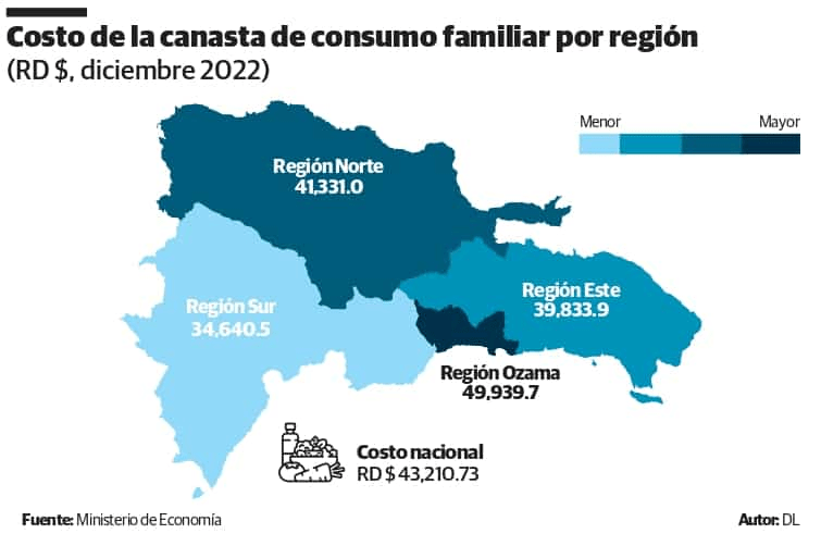 En contraste, en la región Ozama, conformada por el Distrito Nacional y la provincia de Santo Domingo, la canasta básica era la más cara del país a diciembre del año pasado (49,939.7 pesos), viéndose afectado el poder adquisitivo de los hogares, que solo pueden cubrir el 75.8 % de ella (30,194 pesos).