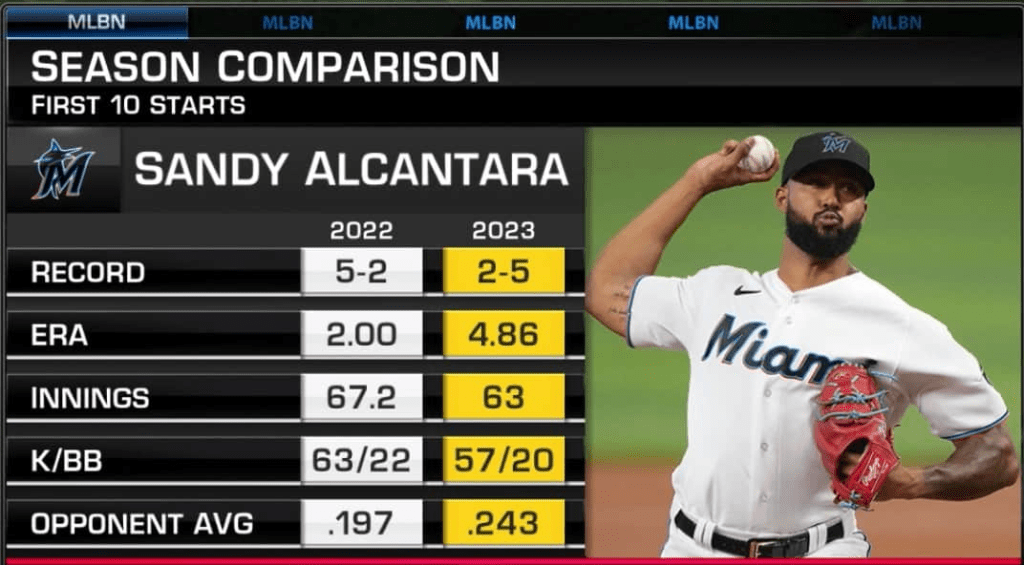 Sandy Alcántara tuvo su décima primera salida de la temporada este martes ante los Padres de San Diego en el Loandepot Park y fue una muestra más, de que no es el mismo lanzador de la temporada 2022.