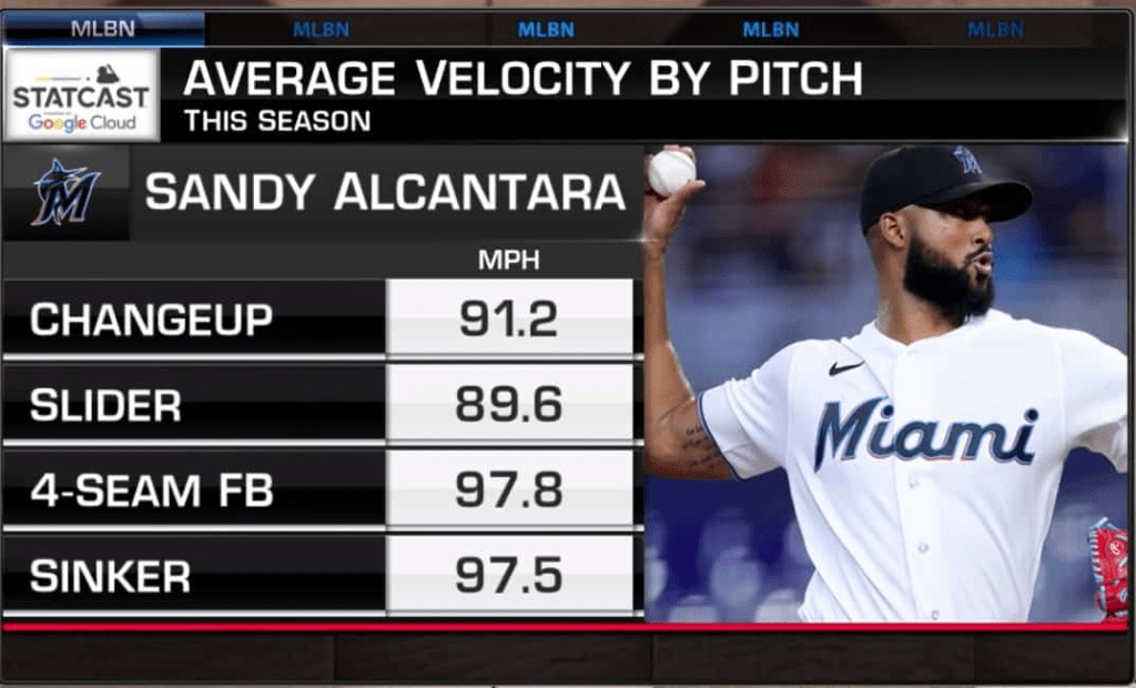 Según el exlanzador de Grandes Ligas y analista de MLB Network, Jake Peavy, la similitud en la velocidad entre los pitcheos principales de Alcántara, puede ser parte del problema, la recta de cuatro costuras y el sinker están en 98MPH, y el cambio, que está supuesto a sacar de paso a los bateadores contrarios, está en 91MPH, con el slider a 90MPH, si el lanzador no logra colocar esos pitcheos en puntos negros del plato, va a tener problemas para sacar outs, a Alcántara le estudiaron su secuencia de pitcheos y si no puede colocar sus lanzamientos donde quiere, eso se traduce en complicaciones.