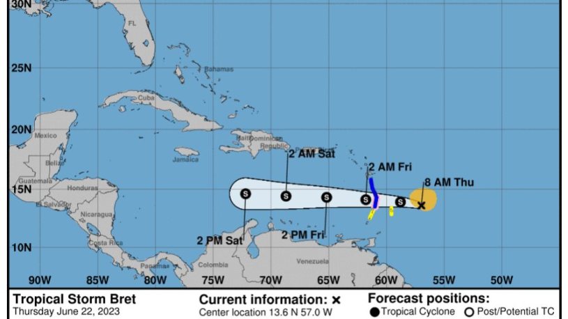 A las 5:00 AM, el centro de la tormenta tropical Bret estaba ubicado cerca de la latitud 13.7 Norte, longitud 56.6 Oeste y se mueve hacia el oeste cerca de 24 kilómetros por hora.