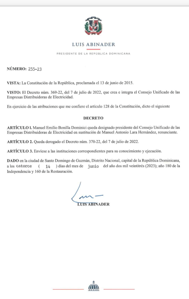 El presidente Luis Abinader emitió el Decreto 255-23 con el que designa a Manuel Emilio Bonilla Dominici como nuevo presidente del Consejo Unificado de las Empresas Distribuidoras de Electricidad (CUED).