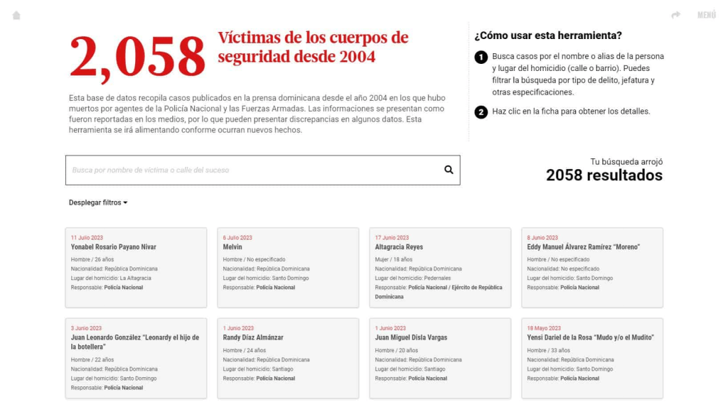 El trabajo destaca por su aporte documental al poner al servicio al público una amplia base de datos creada para la serie y que sigue siendo de actualización continua, según los reportes públicos de nuevos casos de muertes de civiles a manos de miembros de la Policía Nacional y las Fuerzas Armadas.A la fecha y desde 2004 se han compilado en la base de datos 2,058 víctimas, cada una con una ficha que reúne informaciones relevantes sobre las circunstancias que rodean sus muertes.