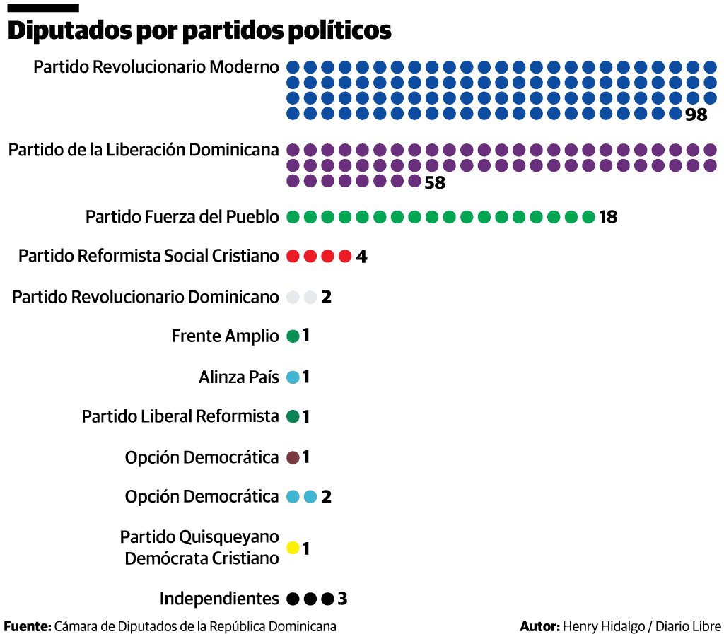 No obstante, el oficialista Partido Revolucionario Moderno (PRM) tiene 98 votos, mientras los dos principales opositores suman 76, de ellos 58 de los peledeístas y 18 de Fuerza del Pueblo. Los 16 restantes corresponden a algunos aliados, opositores e independientes.