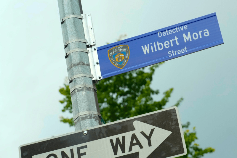 La intersección de las calles Keap y Tercera Sur del vecindario Williamsburg ha sido bautizada el martes en memoria del policía dominicano Wilbert Mora, asesinado de manera brutal en un apartamento de Harlem junto a su compañero dominicano Jason Rivera el pasado 21 de enero de 2022.
