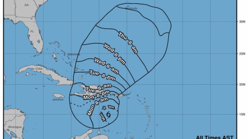 Según publica el Centro Nacional de Huracanes de Estados Unidos, el fenómeno ingresará al país por la parte suroeste, y atravesará la isla de sur a norte.