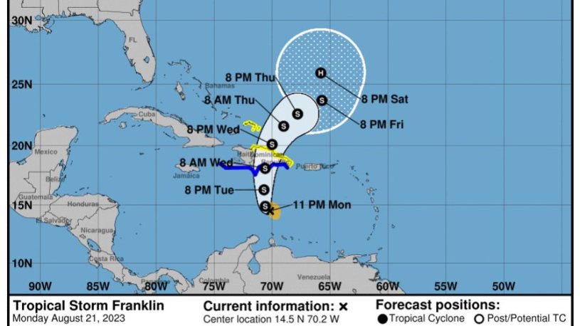 «Franklin debe girar hacia el norte el martes, con este movimiento general continuando hasta el miércoles. En la trayectoria pronosticada, se pronostica que el centro de Franklin alcance la costa sur de La Española el miércoles«, cita el boletín de aviso número 6.