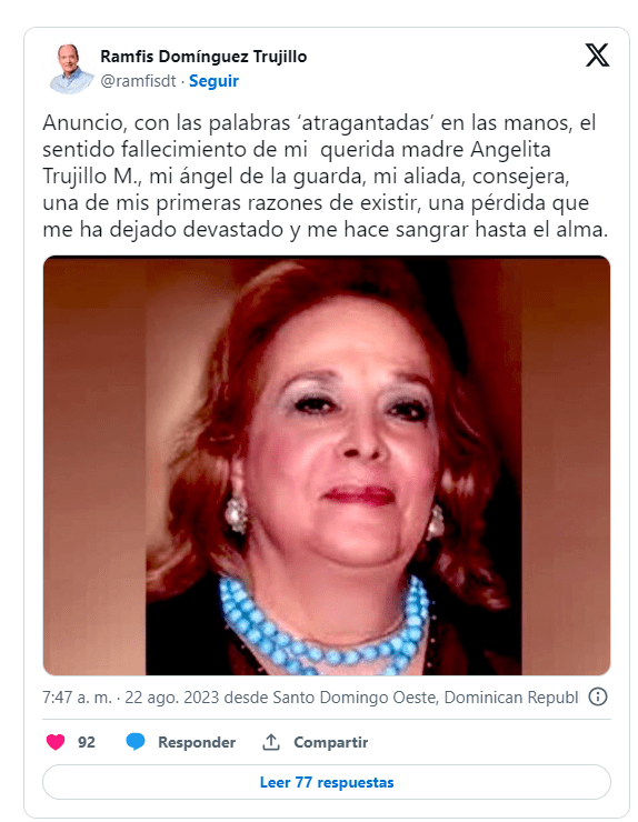 “Anuncio, con las palabras ‘atragantadas’ en las manos, el sentido fallecimiento de mi querida madre Angelita Trujillo M., mi ángel de la guarda, mi aliada, consejera, una de mis primeras razones de existir”, publicó a través de su cuenta de X.