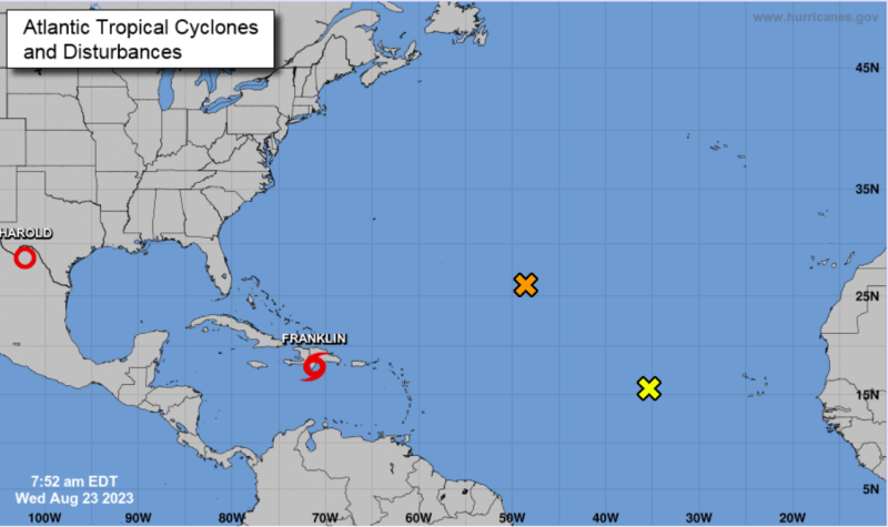 El Centro Nacional de Huracanes (NHC, por sus siglas en inglés) informa que el centro de la tormenta tropical Fanklin se encuentra próximo a la costa sur de República Dominicana.