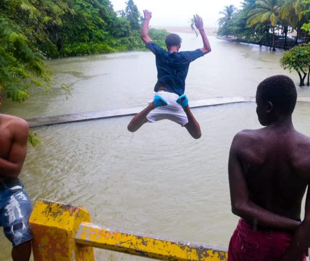 Entre los audiovisuales que se hicieron virales ayer, estuvo el de la osadía de un grupo de adolescentes que se lanzaban de cabeza de un segundo nivel de una vivienda al agua que había anegado la calle.