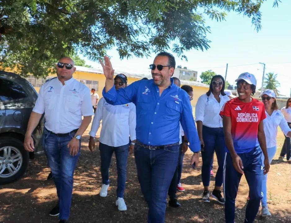El director ejecutivo del INEFI, Alberto Rodríguez Mella, recorrió el patio y la cancha de la escuela Cristóbal Alvino Falcón, de Don Gregorio, Nizao, con la campeona mundial de los 400 metros planos, Marileidy Paulino. y varios técnicos, profesores y alumnos.